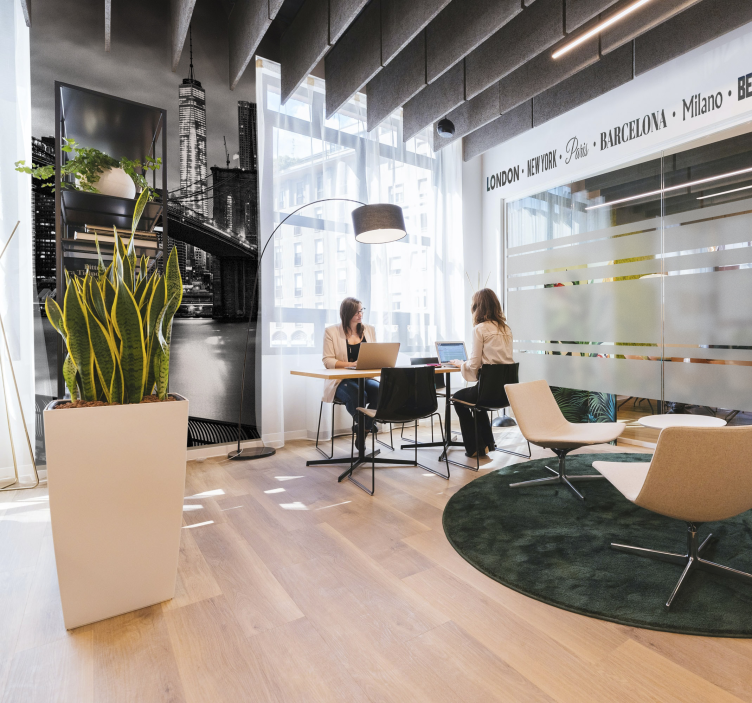 Riferimento: F12189Un moderno spazio per uffici presenta due individui impegnati in una riunione, con un'impressionante murales che rappresenta lo skyline della città con i suoi monumenti iconici. Una pianta vivace aggiunge un tocco di natura, migliorando l'ambiente interattivo. Il design enfatizza una fusione tra vita urbana e collaborazione professionale.