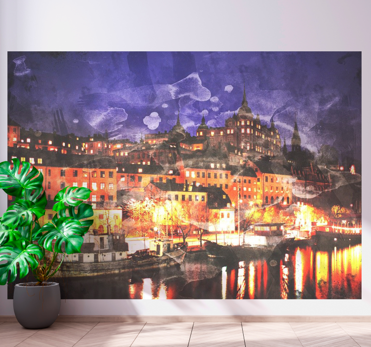 Immergetevi in un'atmosfera incantevole con il nostro Fotomurale città vivace notte cittadina, che cattura l'essenza di Stoccolma in tutta la sua bellezza. Il design presenta luci scintillanti della città che si riflettono sul fiume, creando un effetto magico che trasforma ogni parete in una finestra su una città svedese viva e vibrante. Le architetture eleganti si stagliano contro il cielo notturno, mentre l'acqua, illuminata dalle luci, rende l'immagine ancora più suggestiva.