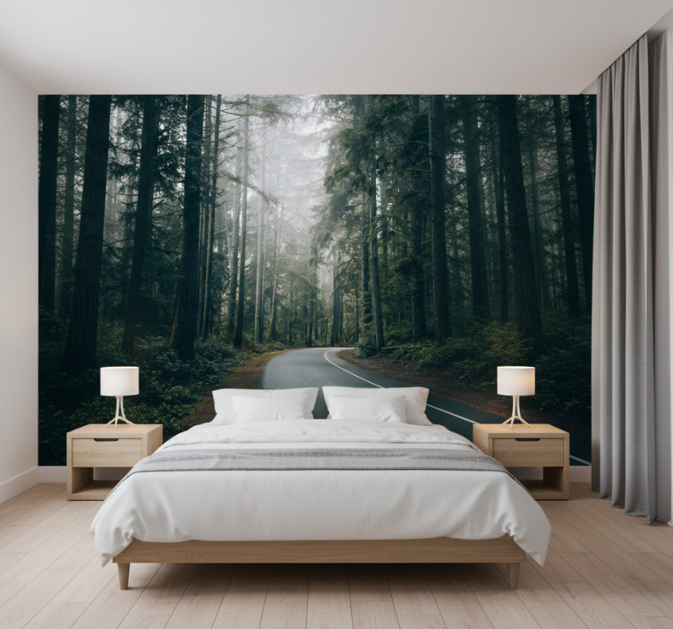 Fotomurale foresta strada di pini nebulosa