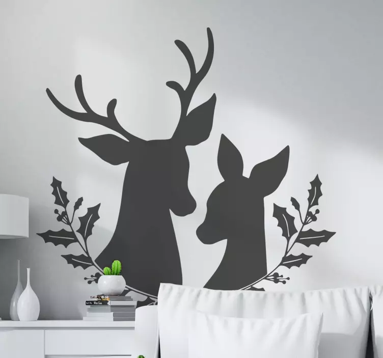 Riferimento: A46840Una rappresentazione affascinante di due cervi con corna intricate e espressioni dolci, incorniciati da rami di agrifoglio. Questo design evoca una sensazione di calore e connessione con la natura, perfetto per trasformare qualsiasi spazio in un ambiente sereno e accogliente.