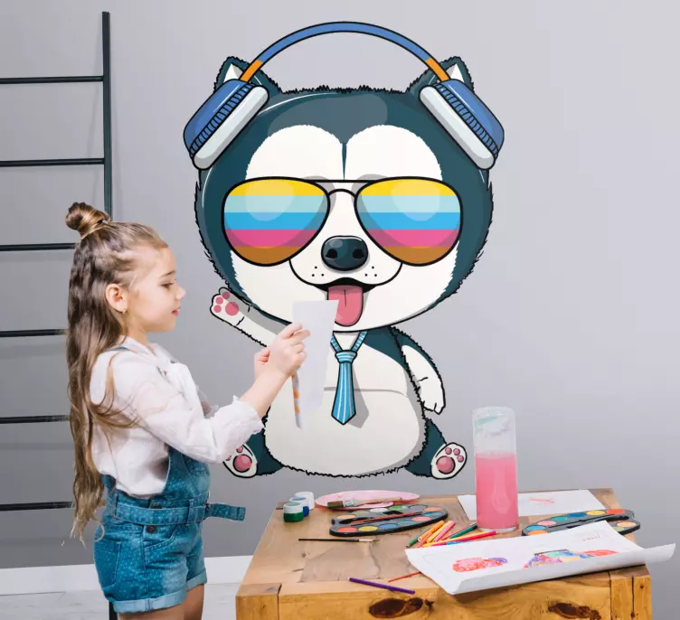Scopri i nostri adesivi animali per bambini personaggi animali cool, caratterizzati da un design allegro e vivace! Immagina un dolce cane cucciolo che indossa occhiali da sole e una cuffia in uno stile cartone animato carino, perfetto per divertire i più piccoli. I colori brillanti e il tema musicale rendono questi adesivi un elemento giocoso e colorato per ogni stanza dei bambini!