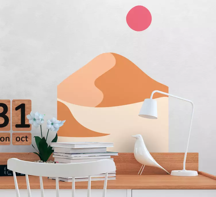 Scopri il nostro adesivo decorativo dune di sabbia astratte, un'opera d'arte che trasforma ogni spazio in un'oasi di bellezza! Questo design presenta un'illustrazione astratta di montagne, sabbia e dune, tutto illuminato da un sole splendente, creando un'atmosfera minimalista che celebra la natura. Perfetto per chi ama l'arte e la semplicità, questo adesivo arricchirà le tue pareti con un tocco unico e originale.