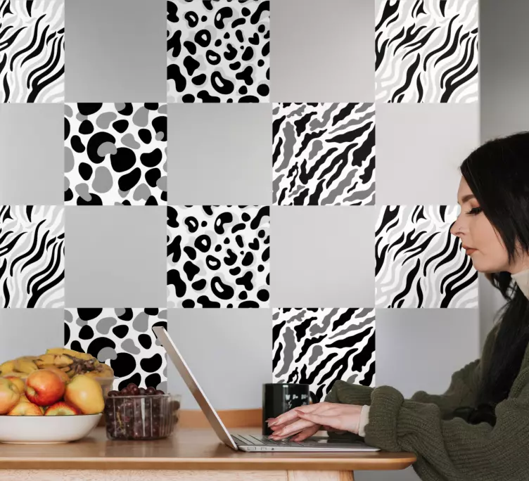 Scopri il nostro Adesivo decorativo piastrelle eleganti a motivi, un elemento di design che unisce eleganza e modernità! Il suo affascinante design presenta una combinazione di tegola, piastrelle, leopardo e impronta animale in un formato monocromo, con una struttura astratta e geometrica. Questo è il tocco perfetto per trasformare ogni ambiente in uno spazio unico e affascinante!