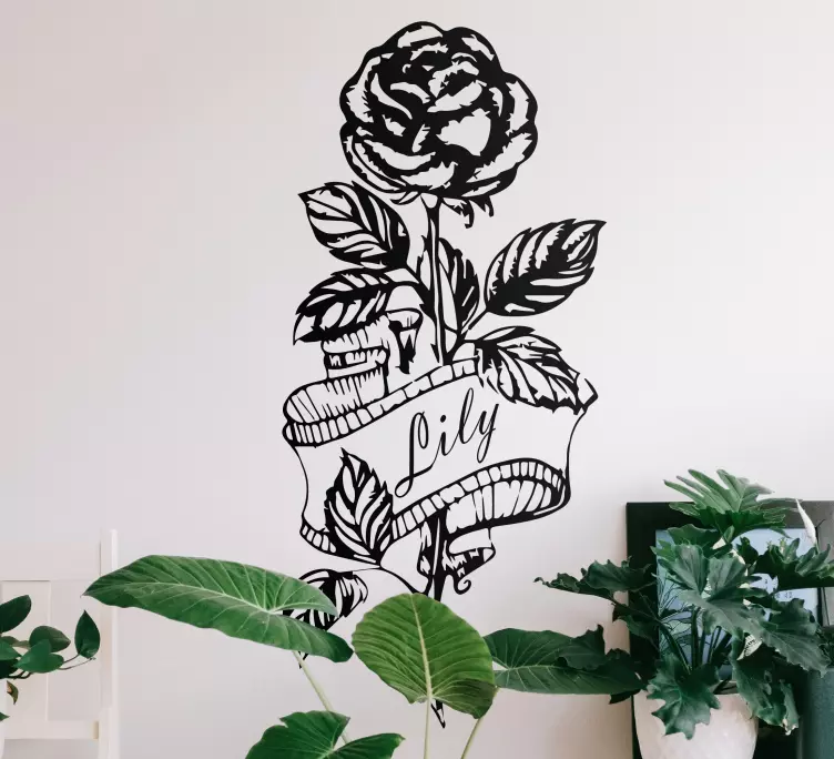Scopri il nostro Adesivo fiore decorazione rosa nera, un'elegante fusione di design floreale che cattura l'essenza della natura! Con un bellissimo disegno di un fiore rosa su uno sfondo bianco e nero, questo prodotto è perfetto per chi desidera personalizzare i propri spazi con un tocco di classe. Il nastro che accompagna il nome personalizzato rende questa decorazione unica e speciale, perfetta per dare vita a qualsiasi ambiente.