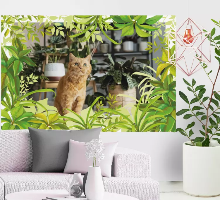 Riferimento: A48313Una scena incantevole che presenta un gatto attento circondato da una lussureggiante vegetazione. Il design cattura l'essenza della natura intrecciata con il comfort domestico, mostrando il comportamento curioso del gatto tra una varietà di piante d'appartamento.