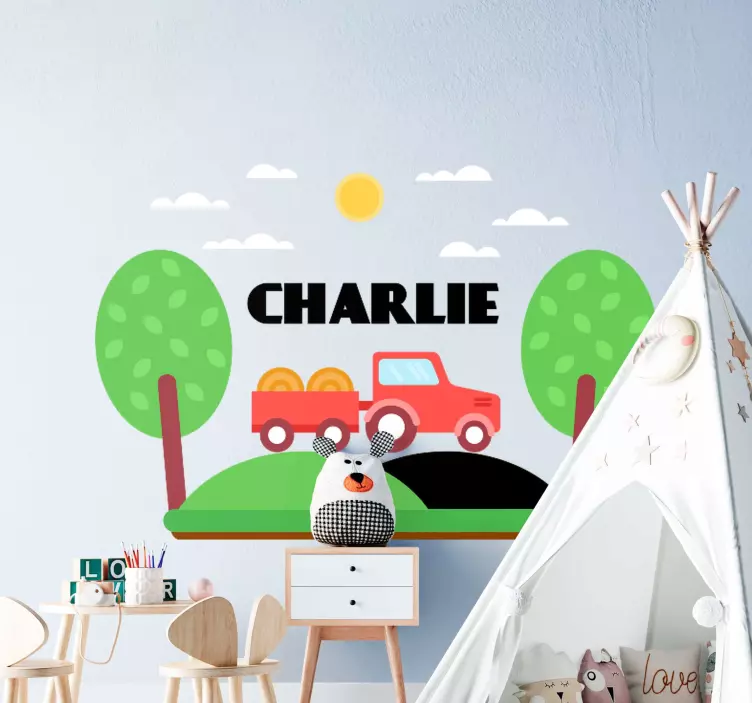 Scopri il nostro adesivo per bambini scena camion personalizzata, un prodotto unico per decorare le camere dei più piccoli! Il design vivace presenta un camion colorato circondato da un trattore, una azienda agricola, alberi verdi e un sole splendente, creando un'atmosfera allegra e giocosa. Questo giocattolo visivo è perfetto per stimolare l'immaginazione dei bambini e arricchire il loro spazio con un tocco di natura!