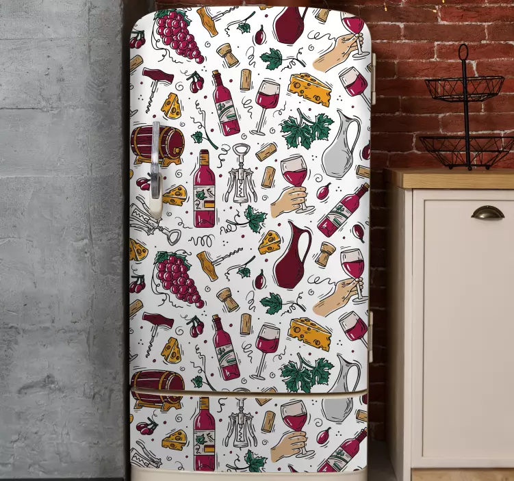 Scoprite il nostro Adesivo per frigo tema cibo e vino, un design straordinario che cattura l'essenza culinaria con elementi come frigo, vino, bicchiere di vino, modello, bottiglie, frigorifero, uva, formaggio e un tocco artistico di disegno a mano. Questo adesivo è perfetto per chi ama decorare la cucina con eleganza e gusto, trasformando il frigorifero in una vera opera d'arte!