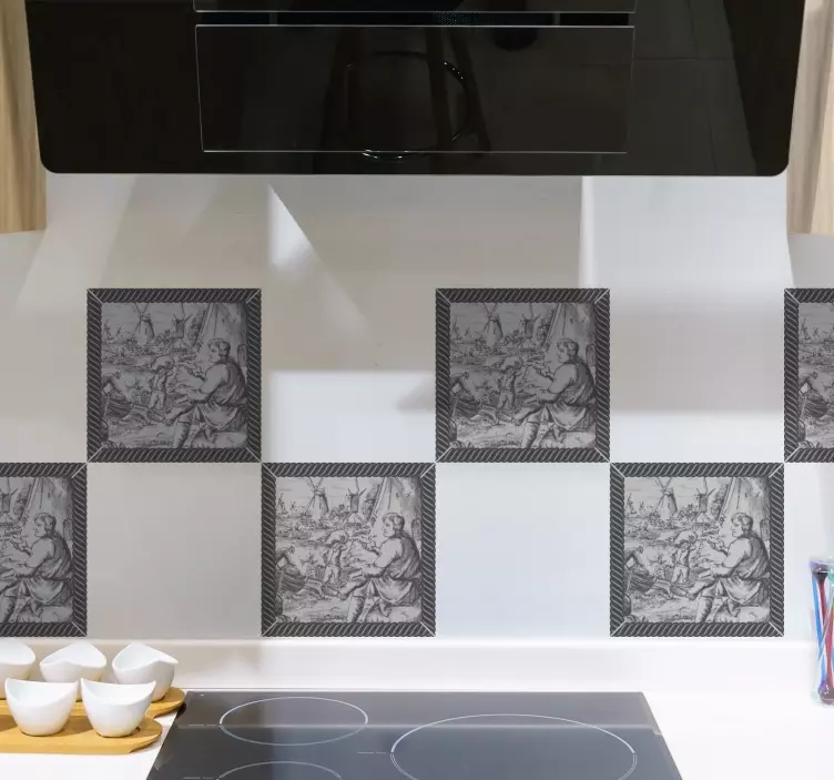 Scopri la magia dell'arte con il nostro adesivo per piastrelle scene storiche, un prodotto unico nel suo genere! Il design, caratterizzato da un affascinante bianco e nero, rappresenta scene storiche di uomini al lavoro, mulini e paesaggi culturali, rendendo ogni ambiente un capolavoro di artigianato e creatività. Questo adesivo artistico non è solo decorativo, ma racconta storie che arricchiscono gli spazi in cui viene applicato!