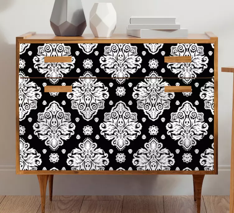 La Carta adesiva per mobile motivo elegante è un vero capolavoro di design, un connubio perfetto di arredamento, teschi, fiori, damasco, ornato e un modello in bianco e nero che richiama uno stile moderno. Questo motivo ornato è ideale per la progettazione di mobili e trasforma ogni interno della casa in un'opera d'arte!