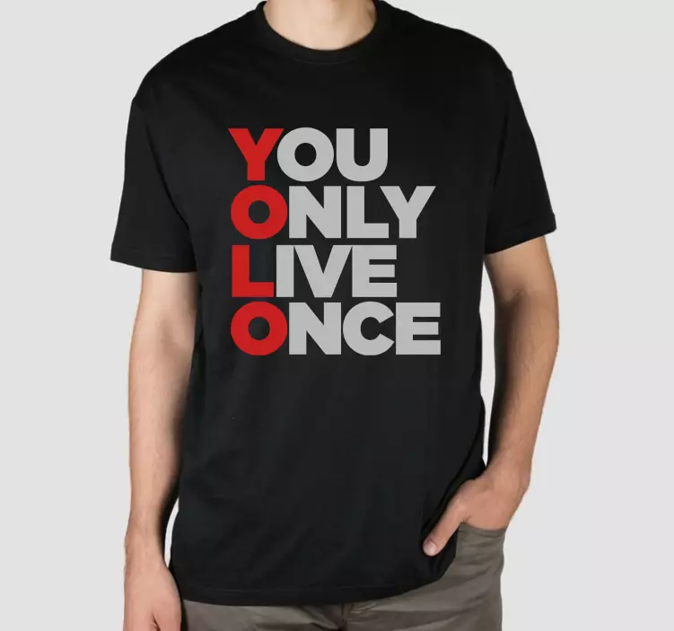 Riferimento: T4851Questo abbigliamento audace presenta la frase d'impatto 'You Only Live Once', sottolineando un messaggio di vivere la vita al massimo. Il design utilizza una tipografia forte con colori contrastanti, rendendolo accattivante e attraente per chi cerca di esprimere un atteggiamento vibrante.