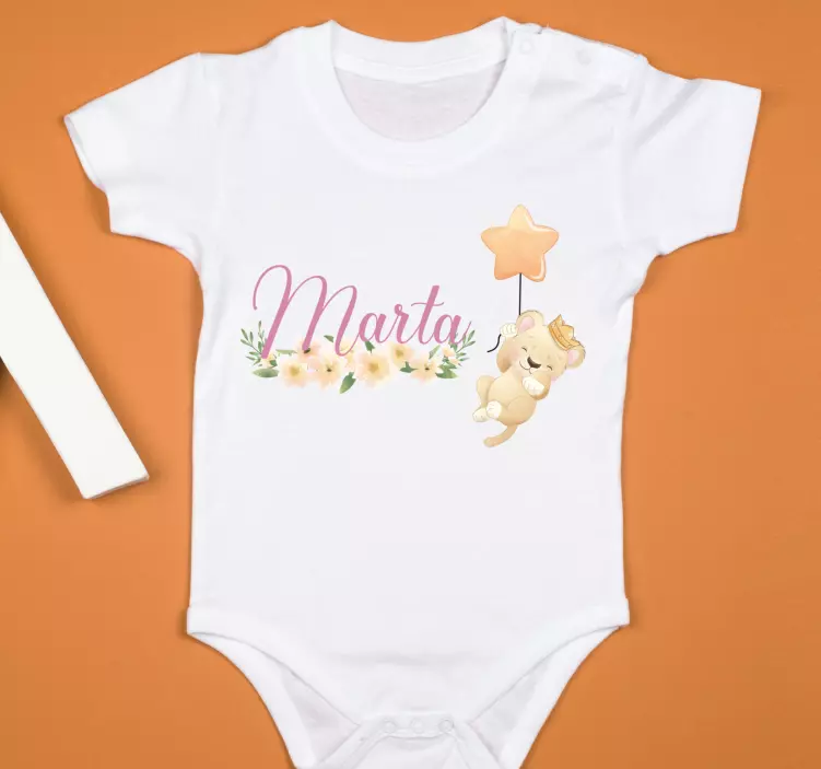 Riferimento: T5219Questo affascinante design presenta un orsetto carino che tiene un palloncino a forma di stella, arricchito da delicati elementi floreali. Il nome 'Marta' è elegantemente integrato nell'opera, creando un tocco gioioso e personalizzato, perfetto per l'abbigliamento per bambini.