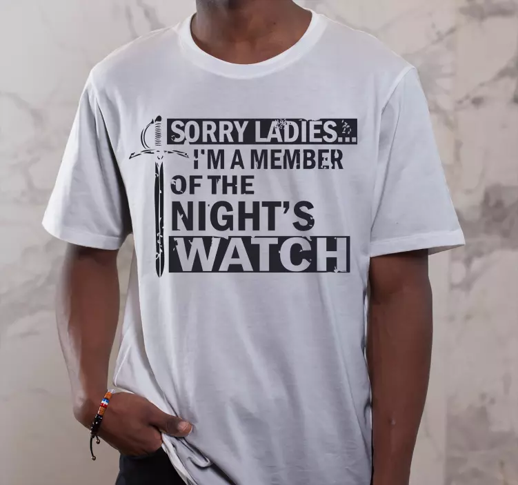 La Maglietta dichiarazione audace è un indumento unico nel suo genere, caratterizzato da un design accattivante che presenta una spada ispirata a Game of Thrones e una citazione divertente che farà sorridere chiunque la legga. Con il suo testo umoristico e le scritte che richiamano la guardia notturna, questa camicia bianca è perfetta per chi desidera aggiungere un tocco di originalità al proprio abbigliamento casual!