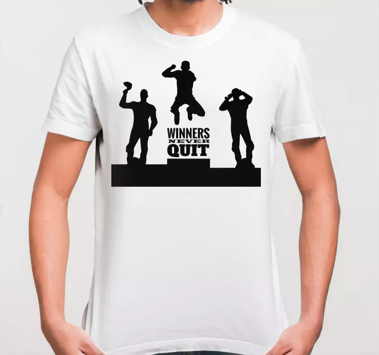 Riferimento: T4890Questo design presenta una potente frase motivazionale accanto a silhouette di figure trionfanti in azione. L'immagine cattura l'essenza della persistenza e del successo, rendendola ideale per gli appassionati che celebrano i risultati. Il contrasto tra bianco e nero aggiunge un'affermazione audace a qualsiasi abbigliamento casual.