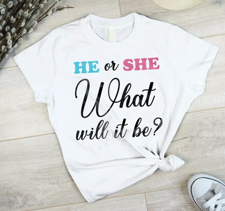 Riferimento: T4722Questo abbigliamento accattivante presenta una domanda divertente sul gender reveal, chiedendo 'What will it be?' con un testo vivace. L'uso giocoso dei colori aggiunge entusiasmo, rendendolo perfetto per celebrazioni familiari e momenti indimenticabili.