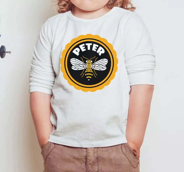 Riferimento: T4984Questo design affascinante presenta un'illustrazione vivace di un'ape circondata da un audace bordo giallo a scallop. Il nome 'Peter' in evidenza aggiunge un tocco personale, rendendolo perfetto per i bambini. La combinazione di colori giocosi e un motivo coinvolgente crea un aspetto attraente per l'abbigliamento infantile.