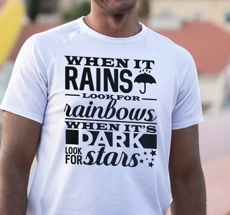 Riferimento: T4888Questo top elegante presenta una frase motivante che incoraggia una mentalità positiva. Il design combina in modo intelligente immagini di pioggia, arcobaleni e stelle, rendendolo una scelta riflessiva per chi cerca motivazione nei momenti difficili.