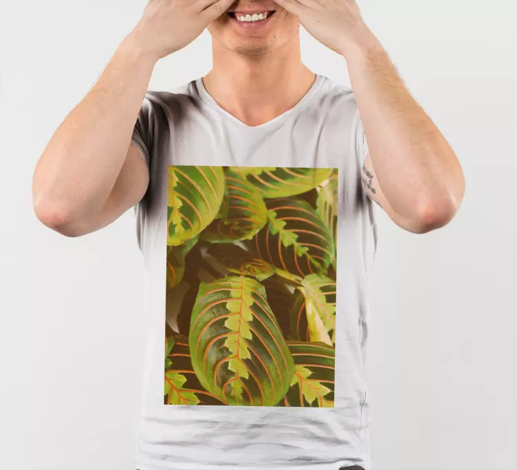 Scopri la nostra maglietta motivo foglia verde, un capo d'abbigliamento che porta in casa tua l'essenza della giungla tropicale! Il design presenta un'illustrazione botanica di foglie di maranta che si intrecciano in un dipinto vibrante e fresco, evocando la bellezza esotica della natura. Con colori verdi intensi e una struttura leggera, questa maglietta è perfetta per chi ama uno stile di vita all'insegna della freschezza e del comfort!