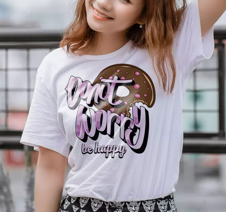 La Maglietta non preoccuparti sii felice è un capolavoro di design che unisce una ciambella colorata a un'illustrazione giocosa e divertente, arricchita da un gioco di parole che invita a mettere da parte le preoccupazioni e a celebrare la felicità! Con scritte positive e un tocco di moda, questa t-shirt è perfetta per chi ama esprimere il proprio stile in modo casuale e allegro.