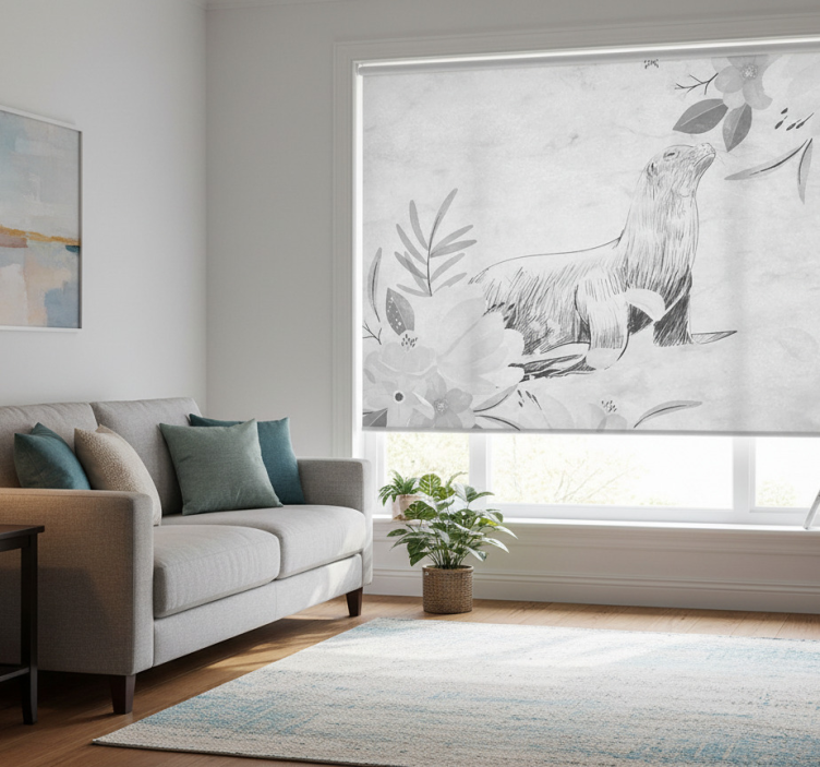 Tenda a rullo bianca foca grigia che nuota e fiori
