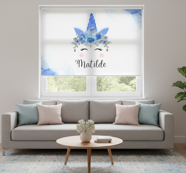 Tenda a rullo bianca occhi e corna di unicorno con nome