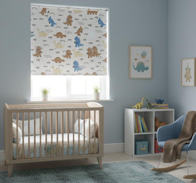 Tenda a rullo cameretta dinosauri blu e marroni felici