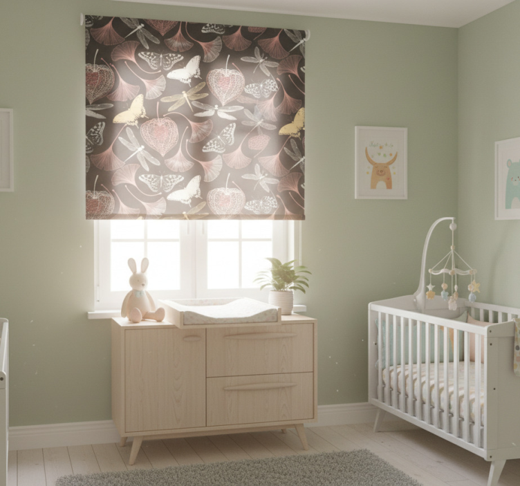Tenda a rullo cameretta foglie rosa farfalle nere