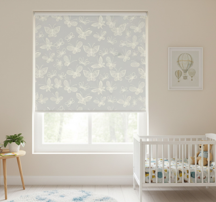 Tenda a rullo cameretta motivo farfalle bianco e grigio