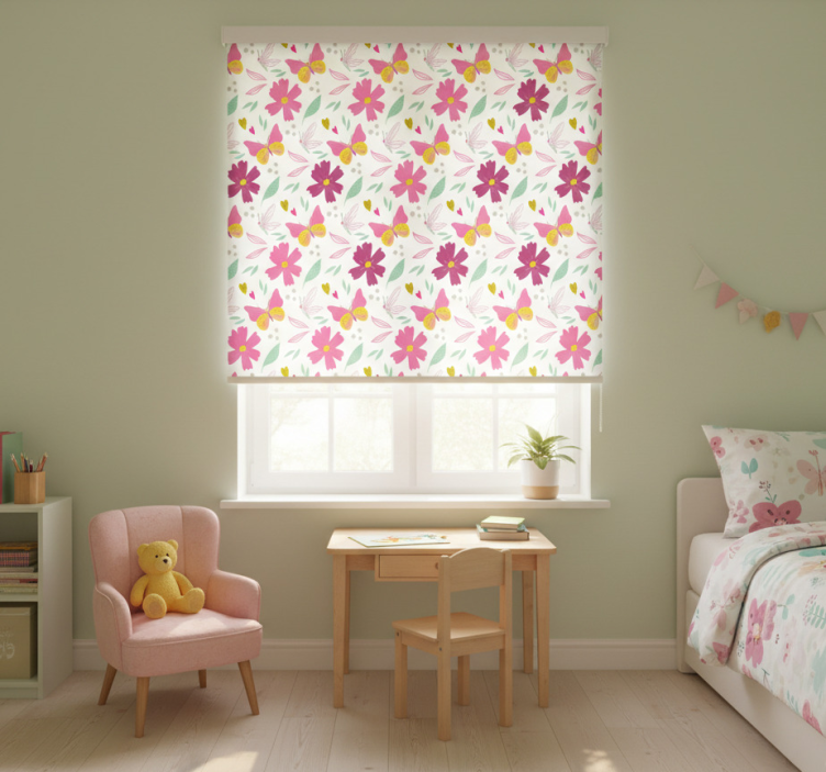 Tenda a rullo cameretta motivo farfalle fiori rosa e gialli