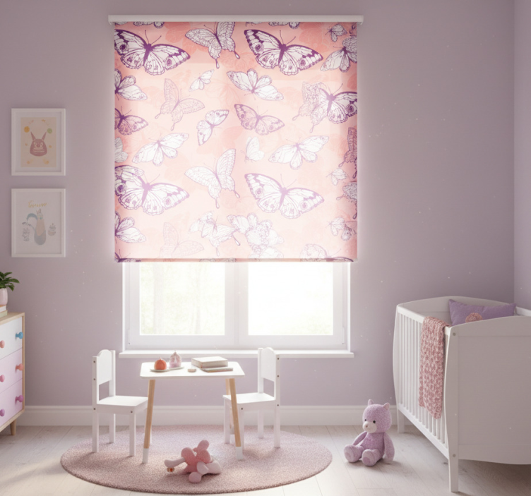 Tenda a rullo cameretta motivo farfalle viola e rosa