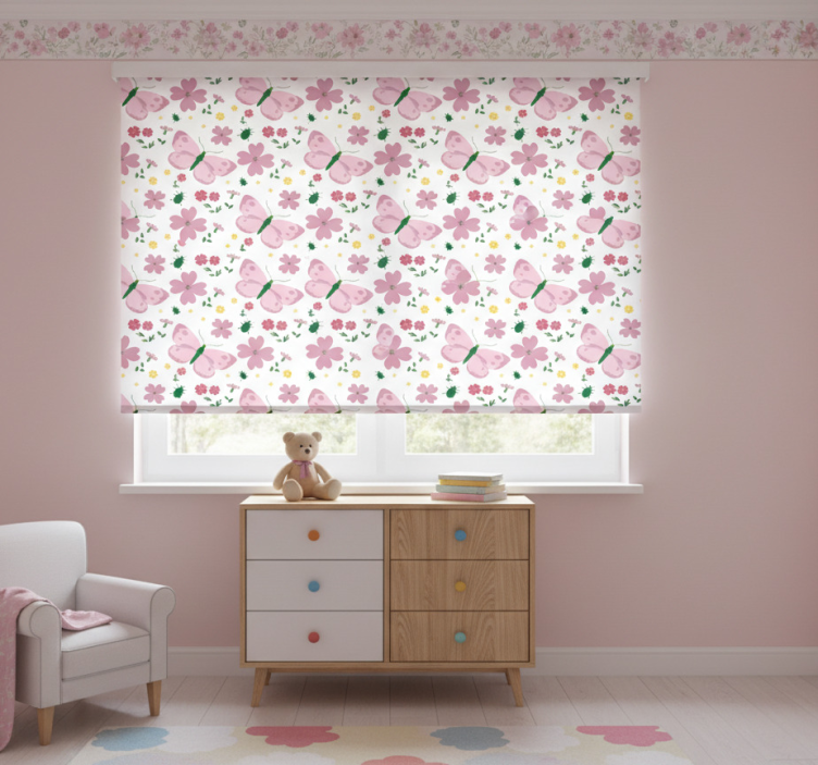 Tenda a rullo cameretta motivo fiori rosa e farfalle