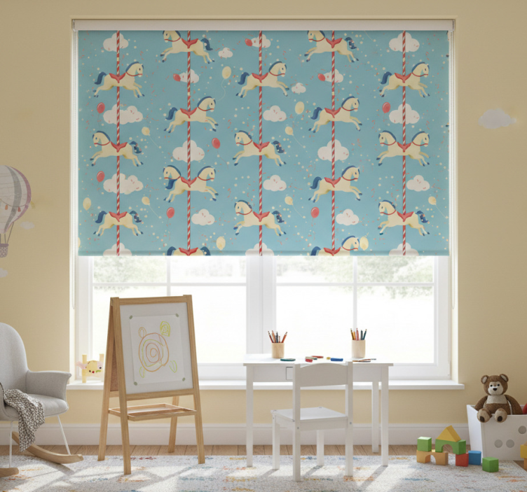 Riferimento: E7042Scopri la nostra Tenda a rullo cameretta motivo giostra cavalli, un elemento di design unico e affascinante per la cameretta dei tuoi bambini! Con un allegro motivo di giostre e cavalli, questa tenda è caratterizzata da colori vivaci, una grafica accattivante e un'atmosfera giocosa che trasforma ogni stanza in un luogo magico!
