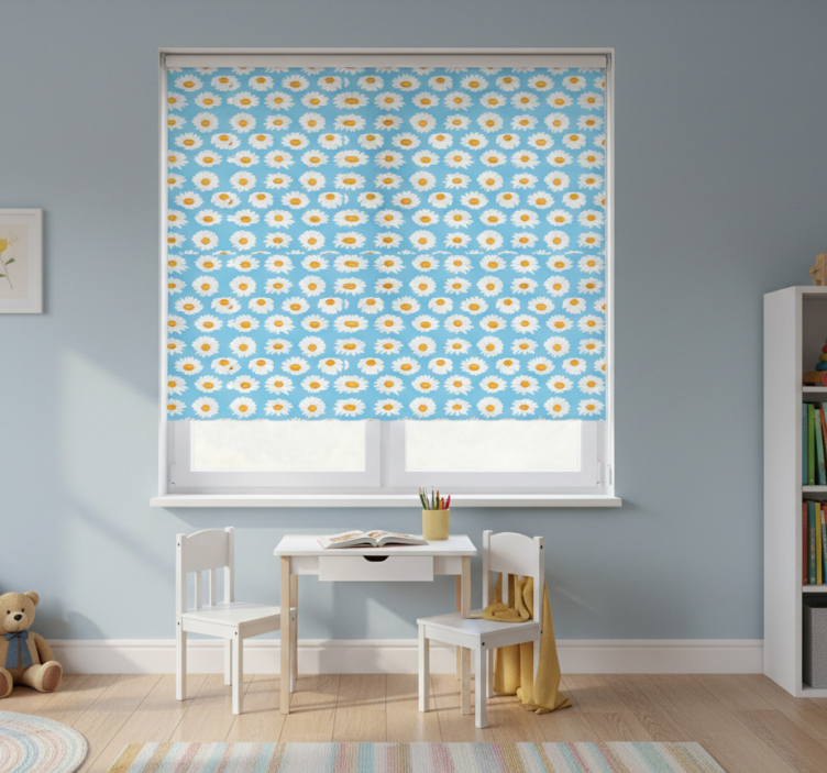 Tenda a rullo cameretta motivo margherite su sfondo azzurro