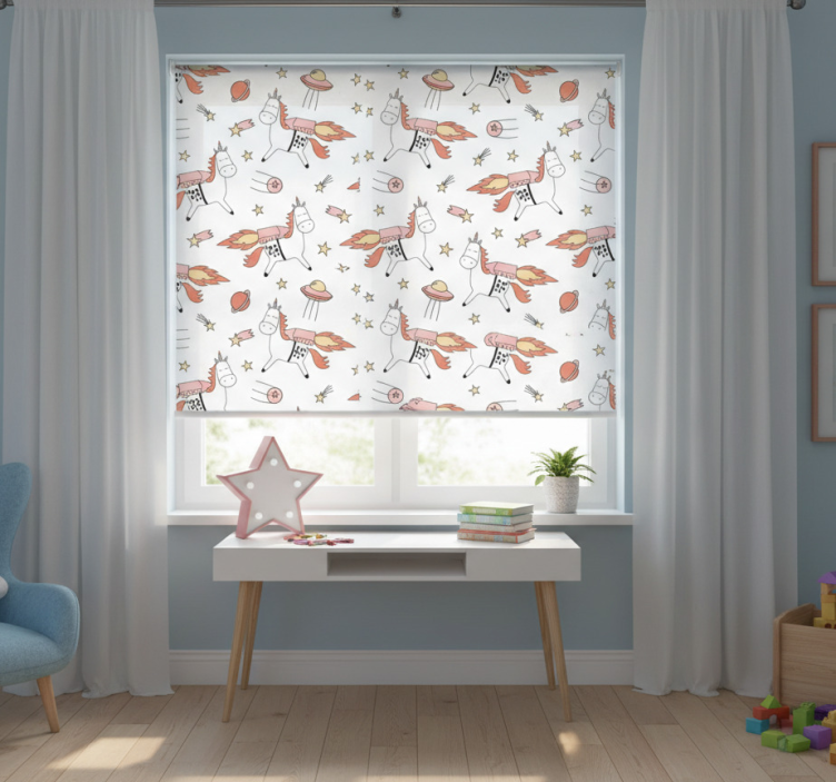 Tenda a rullo cameretta motivo unicorno e simboli spaziali