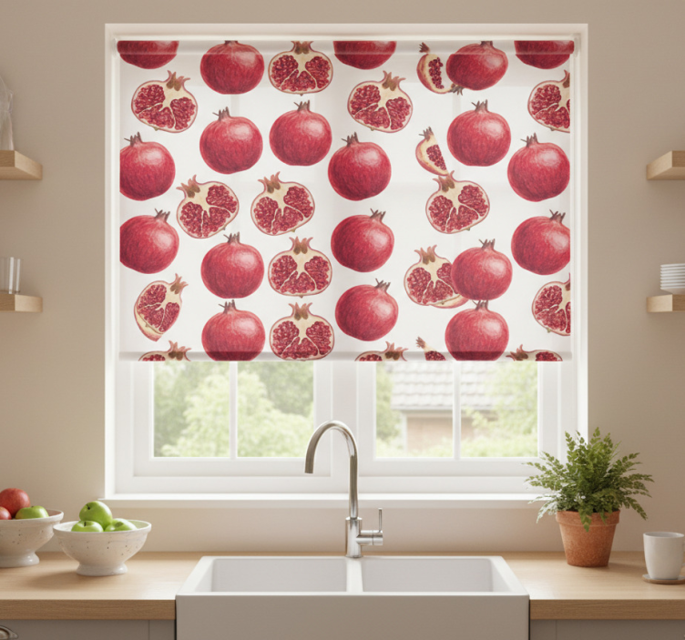Riferimento: E6280La tenda a rullo cucina abbondanza di melograno si distingue per il suo design elegante e vivace, caratterizzato da un motivo che evoca la freschezza dei melograni, con una palette di colori caldi e accoglienti, tessuti di alta qualità e una struttura resistente. Questo prodotto non solo è funzionale ma diventa anche un elemento decorativo che trasforma qualsiasi cucina in uno spazio invitante!