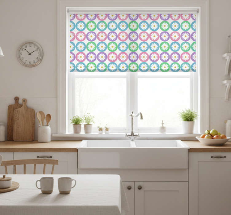 Riferimento: E6297Scoprite la nostra Tenda a rullo cucina cerchi con motivi di margherite, un elemento decorativo che trasforma la vostra cucina in un angolo di freschezza e stile! Questo design unico presenta un motivo accattivante di margherite su uno sfondo vivace rendendo ogni pasto un momento speciale. La facilità di montaggio in 2 clic la rende pratica, mentre la possibilità di scegliere tra diverse texture consente di personalizzare l'intensità della luce e della privacy nella vostra casa.