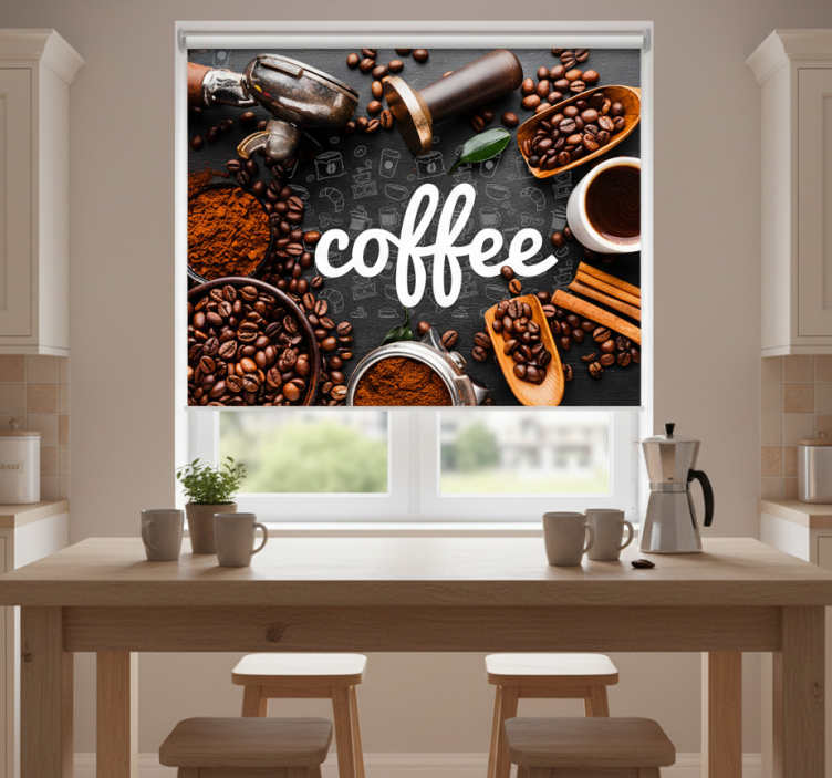Riferimento: E7958Scopri la nostra tenda a rullo cucina ingredienti e utensili caffè, un elemento d'arredo dal design moderno e accattivante, caratterizzato da una facile installazione in 2 clic, una pulizia semplice e un'efficace protezione dalla luce solare diretta. Grazie alla sua versatilità, questa tenda non solo offre privacy quando è abbassata, ma permette anche di regolare la temperatura ambiente, migliorando l'arredamento della tua cucina.