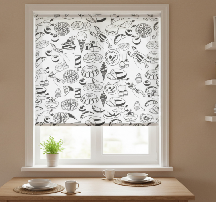 Riferimento: E6291La tenda a rullo cucina motivo cibo bianco e nero è un elemento d'arredo che unisce funzionalità e stile! Con il suo design accattivante, caratterizzato da un motivo di cibo in bianco e nero, questa tenda non solo abbellisce la tua cucina, ma offre anche un'atmosfera vivace e accogliente. Facile montaggio in 2 clic e semplice pulizia rendono questo prodotto un must-have per ogni casa!