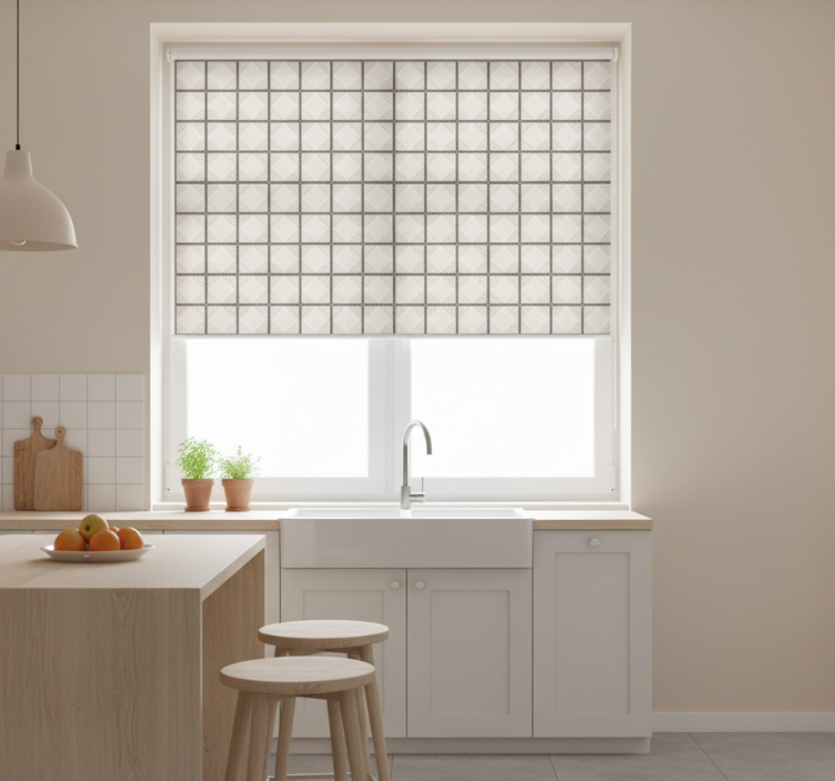 Tenda a rullo cucina piastrelle astratte bianche minimaliste