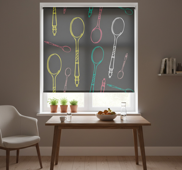 Applicare la tenda a rullo cucina tenda a rullo cucina schizzo di utensili neon è semplicissimo! Basta seguire le istruzioni incluse e il gioco è fatto. In pochi passaggi, potrete godere di un'elegante decorazione nella vostra cucina, senza alcuno sforzo!