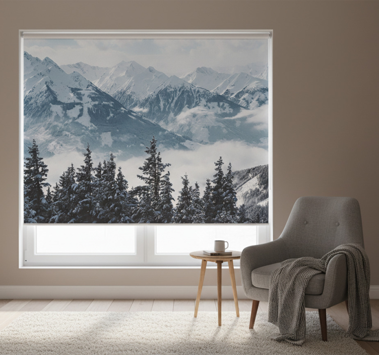 Tenda a rullo soggiorno montagne e alberi innevati